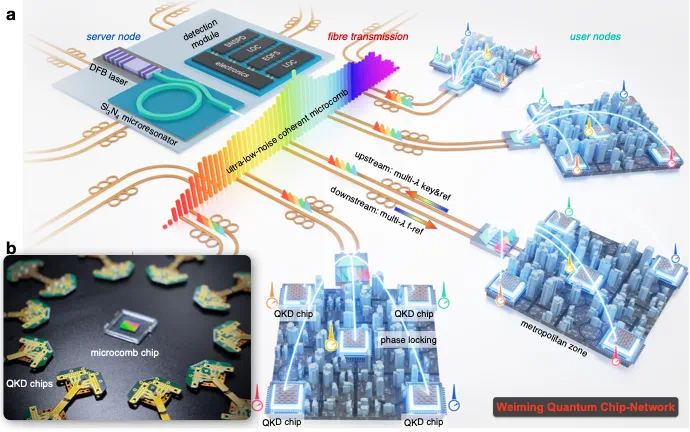 图1 基于光量子芯片的“未名号”大规模量子密钥分发网络:a,双场量子密钥分发芯片网络架构。b,20个QKD芯片和微梳光源芯片实物照片。