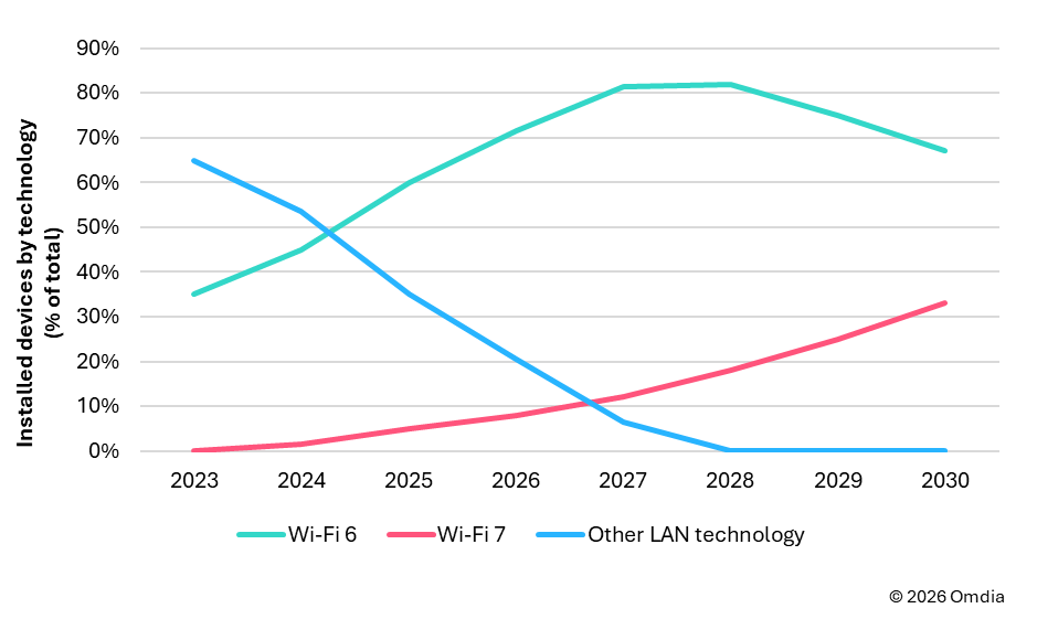 根据Omdia此前发布的《2025–2030年消费者宽带CPE存量预测报告》,美国市场的Wi-Fi 7采用率预计将从2025年占全部存量设备的10%增长至2030年的30%以上(见图1)。然而,根据FCC公布最新相关准则,新型Wi-Fi 7产品进入市场的难度将有所增加。因此,Wi-Fi 7的实际普及率恐将远低于上述预测值;而当Wi-Fi 8问世之时,它或许会直接取代Wi-Fi 7成为市场上的“高端技术”标杆,而非让Wi-Fi 7技术下沉普及至低资费套餐的用户群体中。
