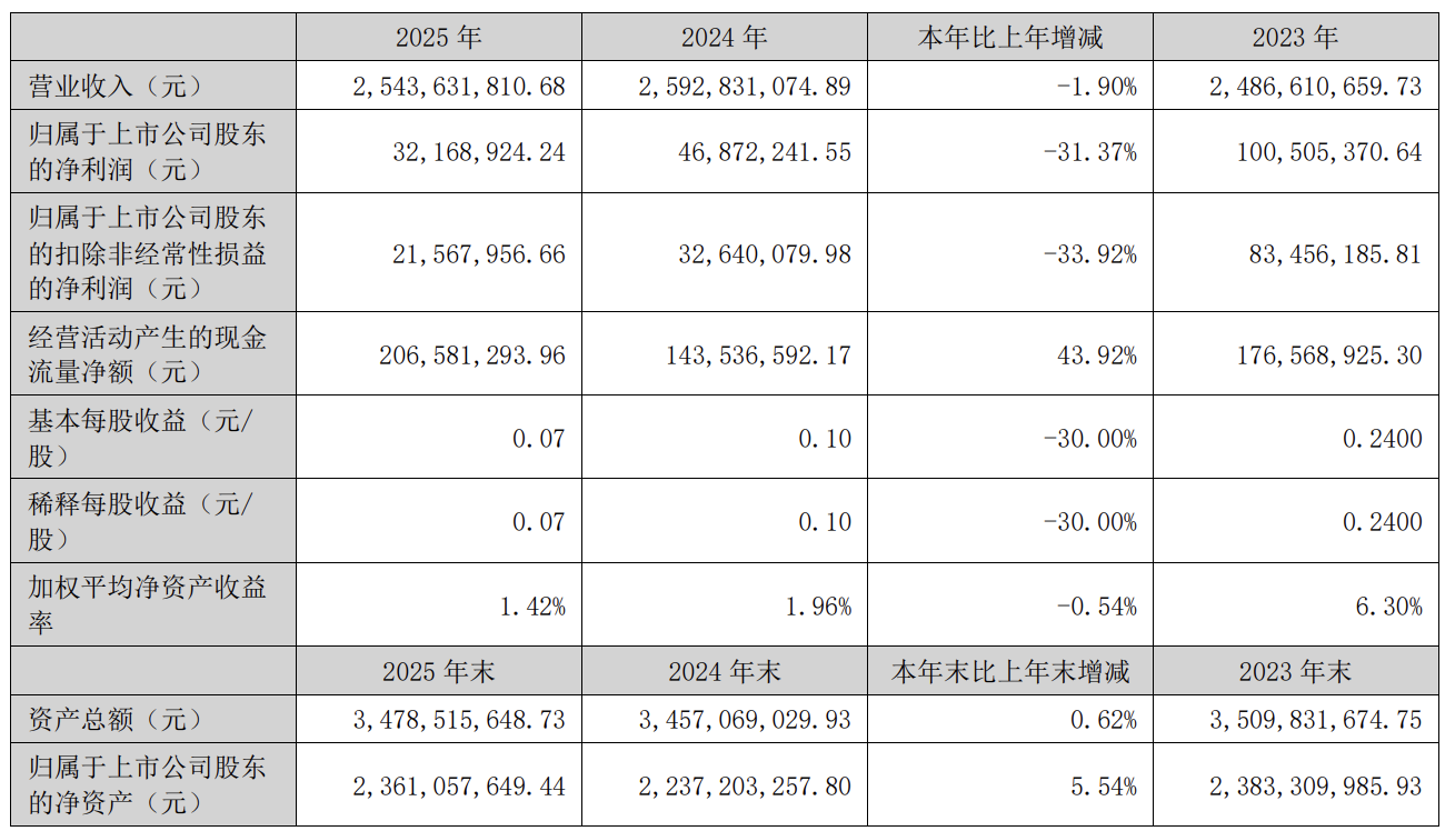 C114讯 4月20日消息(颜翊)上周五,通光线缆发布2025年年度报告。报告期内,公司实现营业收入25.44亿元,同比下降1.90%;归属于上市公司股东的净利润为3216.89万元,同比下降31.37%;扣除非经常性损益后的净利润为2156.80万元,同比下降33.92%;经营活动产生的现金流量净额为2.07亿元,同比增长43.92%。