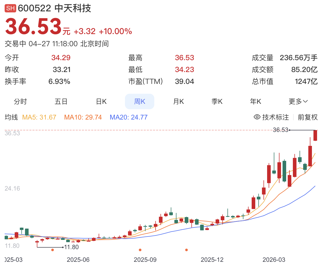 受益一季度的出色业绩表现,中天科技股价今日开盘后涨停,创下历史新高,最新市值为1247亿元。