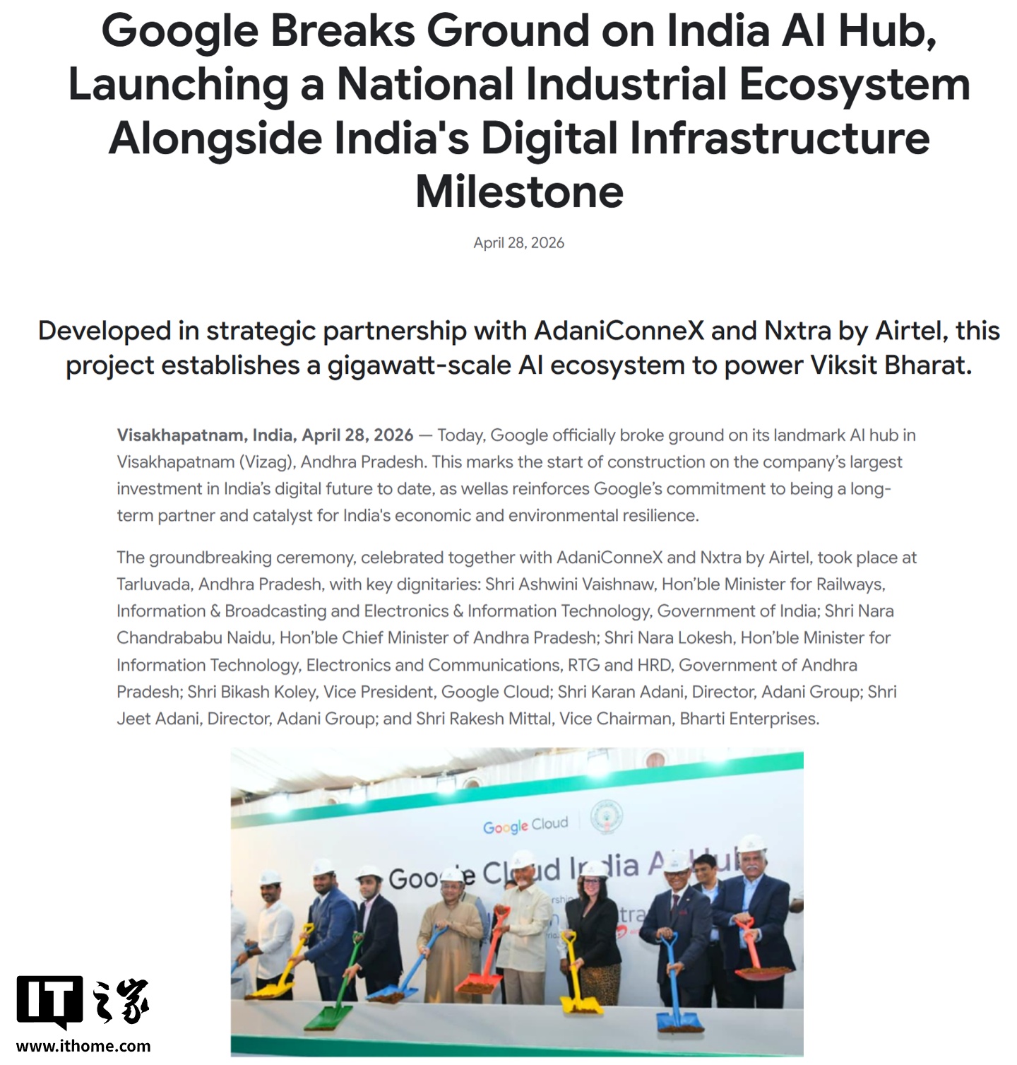 IT之家 4 月 28 日消息,谷歌印度人工智能中心今天在安得拉邦维沙卡帕特南破土动工,将建立千兆瓦级 AI 生态系统,为「发达印度」(Viksit Bharat)计划提供动力。