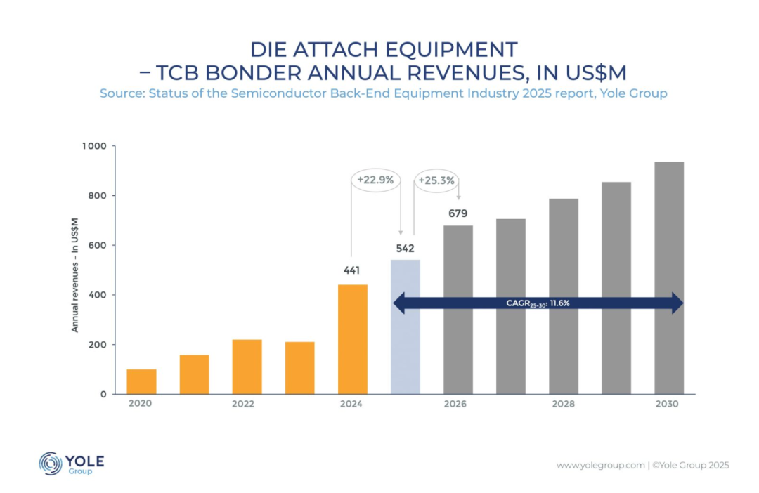 目前,热压键合(TCB)技术在HBM产能提升中扮演关键角色。2025年TCB键合机收入预计为5.42亿美元,到2030年将增至9.36亿美元,复合年增长率为11.6%。Hanmi、ASMPT等供应商在此领域领先。
