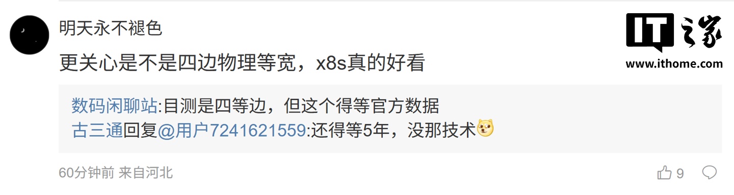 ”;另一位用户则询问道:“更关心是不是四边物理等宽,x8s 真的好看”,博主则回复道:“目测是四等边,但这个得等官方数据”。
