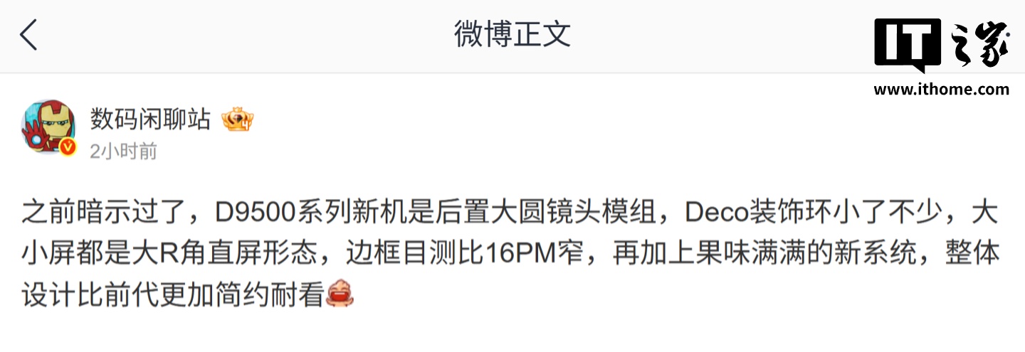 IT之家 9 月 2 日消息,博主 @数码闲聊站 今天在微博透露,某厂的天玑 9500 系列新机后摄将是大圆镜头模组。
