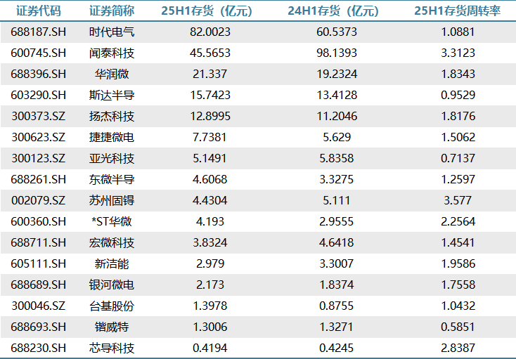 存货下降的企业:闻泰科技从98.14亿大幅降至45.57亿,显示库存快速出清,可能受益于需求回暖或主动去库存;苏州固锝:从5.11亿降至4.43亿,周转率较高(3.577),运营效率良好;宏微科技:从4.64亿降至3.83亿,周转率尚可(1.454),去库存略有成效。
