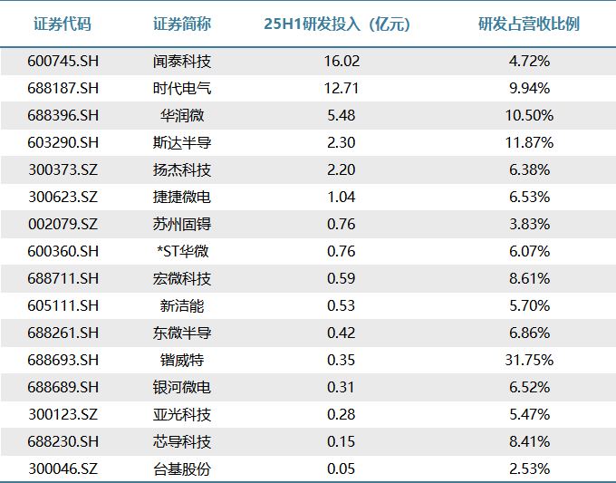 第一梯队(研发投入 > 5亿元):闻泰科技(16.02亿元):投入最高,与其业务多元化(ODM+半导体)和规模相符,但研发占比仅4.72%,显示其营收基数大;时代电气(12.71亿元):投入巨大,聚焦轨交、电网、新能源等高端领域,研发占比9.94%,技术驱动明显;华润微(5.48亿元):IDM龙头,持续加码SiC、MOSFET、IGBT等,研发占比10.50%,保持高强度投入。