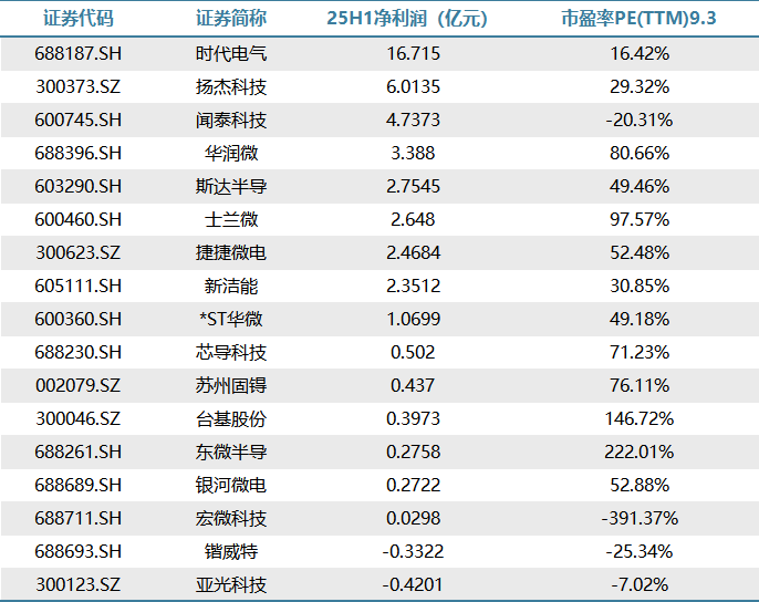 低PE(<30):时代电气(16.42%)、扬杰科技(29.32%)、新洁能(30.85%)估值相对合理,可能与增长稳健、市场预期较为理性有关。