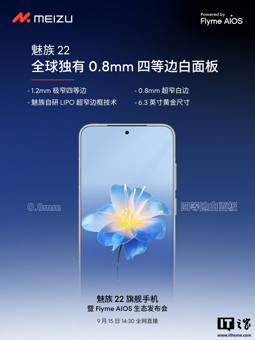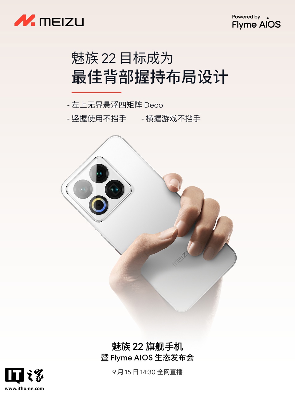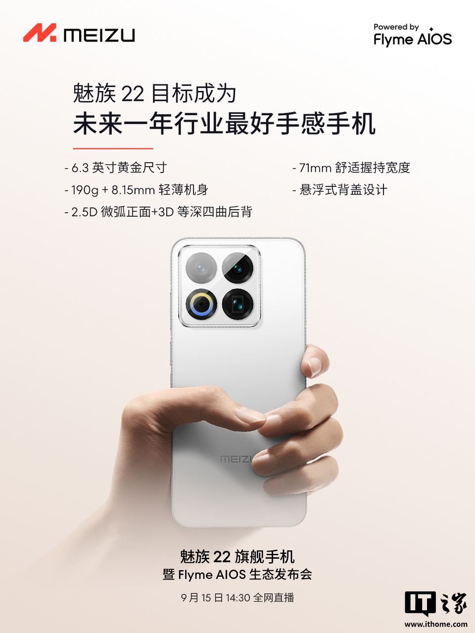 IT之家 9 月 8 日消息,魅族科技官方今日宣布,魅族 22 旗舰手机暨 FlymeAIOS 生态发布会将于 9 月 15 日 14:30 在珠海・魅族科技大楼举行,届时将带来魅族 22 手机、AI 拍摄眼镜、Flyme Auto 2、PΛNDΛER 等新品。