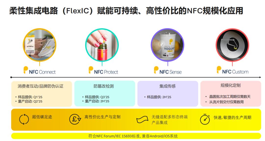 目前,NFC Connect已经采用Pragmatic公司独特的Flex IC技术,以超薄、柔性形态设计和独有的低碳足迹提供符合行业标准的NFC终端功能,该系列产品已于2025年二季度量产,9月启动发货,可满足消费者互动、品牌防伪认证等核心需求。