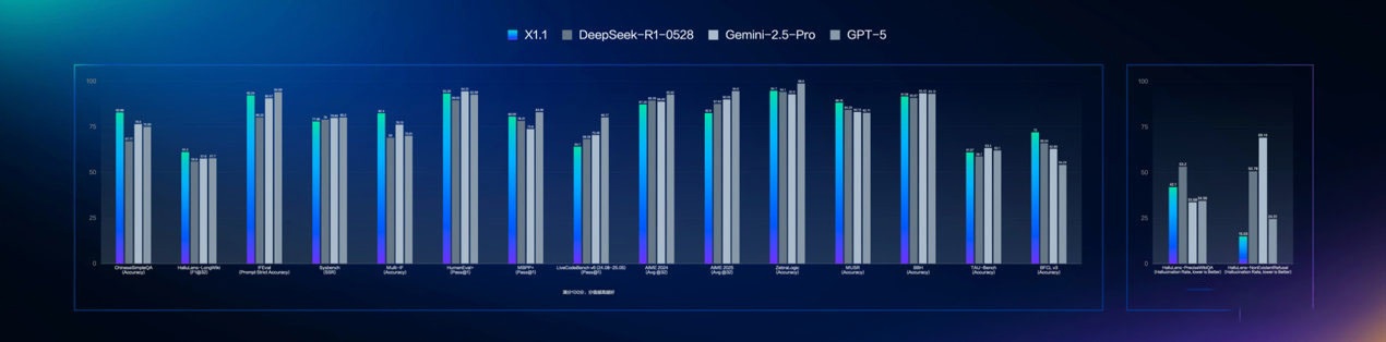 据介绍,文心 X1.1 在多个基准评测中整体表现超越 DeepSeek R1-0528,在部分任务上展现出领先优势。同时,在与国际顶尖模型 GPT-5 和 Gemini 2.5 Pro 相比,效果持平。