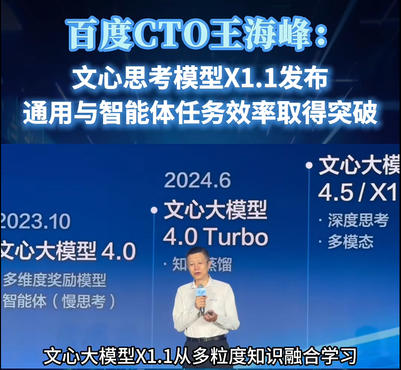 IT之家 9 月 9 日消息,今日,WAVE SUMMIT 深度学习开发者大会 2025 在北京举行。百度首席技术官、深度学习技术及应用国家工程研究中心主任王海峰正式发布了文心大模型 X1.1 深度思考模型。