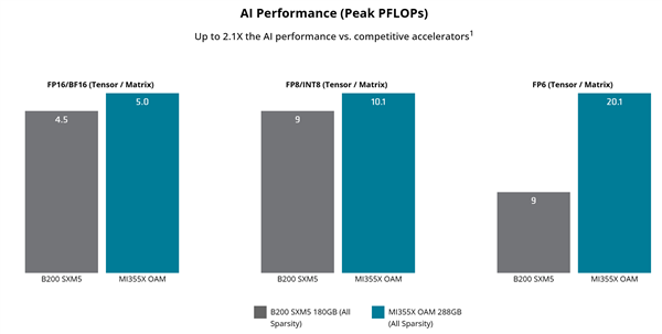 MI355X的FP64性能可达78.6TFLOPS,FP16、FP8及FP4性能则是5、10.1、20.1PFLOPS。
