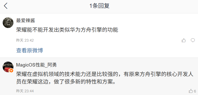 荣耀性能优化研发工程师 @MagicOS性能_阿勇 还在评论区解答了部分网友的疑问,针对“荣耀能不能开发出类似华为方舟引擎的功能”,他表示“荣耀在虚拟机领域的技术能力还是比较强的,有原来方舟引擎的核心开发人员在荣耀这边,做了很多新的特性和方案。”