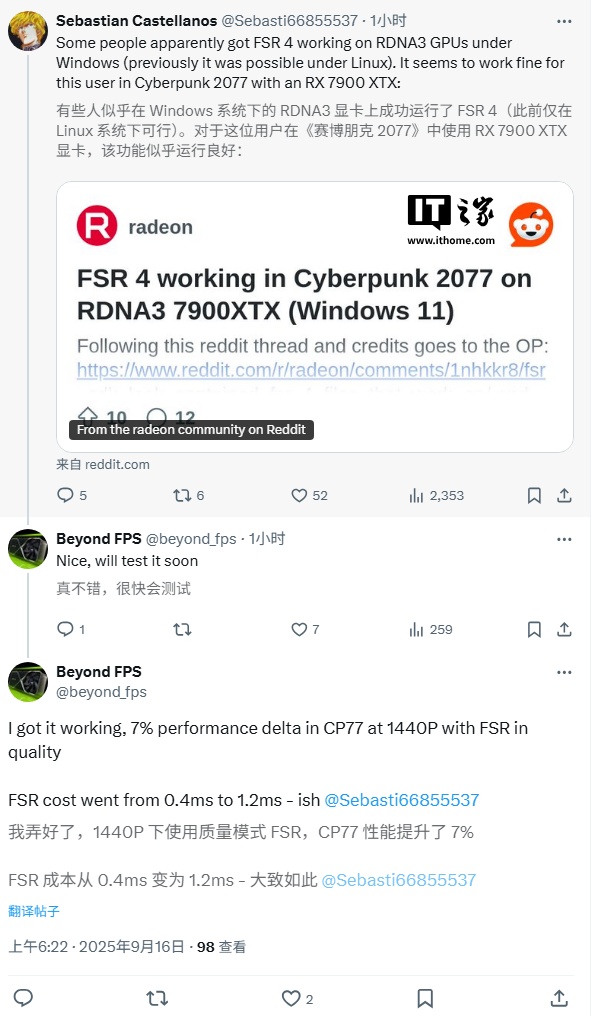 Reddit 用户(ID:u / AthleteDependent926)发现,他可以将 AMD 泄露的 INT8 文件编译为可用的 FSR 4 DLL(已公开上传),非 RDNA 4 显卡的玩家也能通过 Optiscaler 工具替换游戏中的 FSR 3.1,从而在 Windows 系统中启用 FSR 4 支持,包括 Radeon RX 7000 系列、更老的 RDNA 2 显卡以及部分 NVIDIA RTX 30 系列显卡。