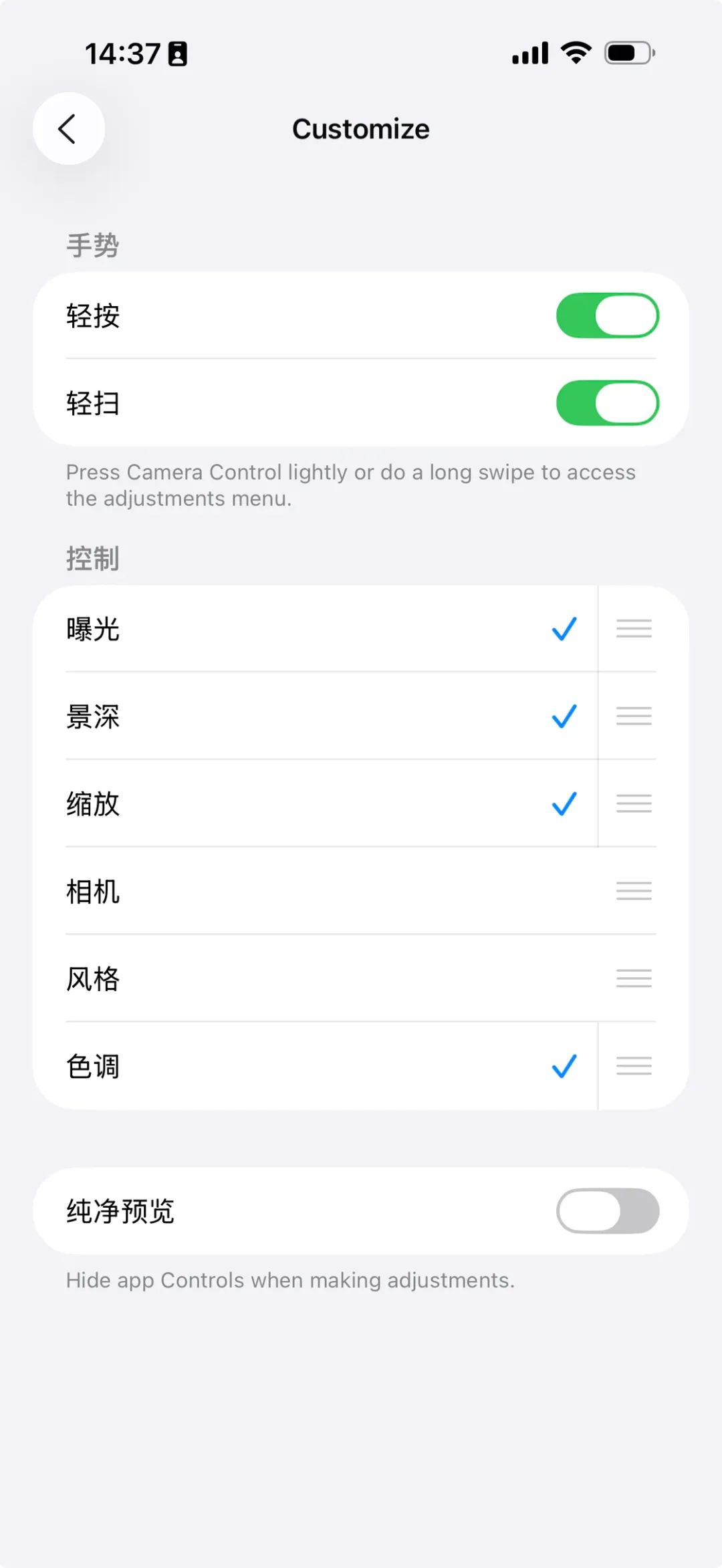 iPhone 16 系列上的相机控制按键在 iOS 26 上获得了自定义功能的权限。首先,我们选择这个按钮的操作手势,自由地选择「轻点」或者「划动」;其次,曝光、景深、变焦、镜头、风格等功能都可以单独启用或者关闭;最后,这些功能也支持自由排序,按照用户的习惯和爱好拖拽即可改变触发的先后顺序。