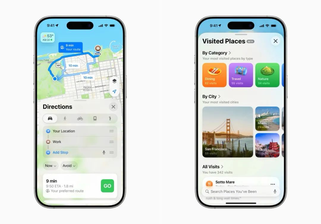 在新版本中,Apple 为地图 app 新增了习惯路线学习功能,还会在习惯路线出现拥堵时提前通知用户,并提供一下备选路线。另外,地图 app 还加入了曾去地点记录功能,用户停留过的地点都会在应用中自动记录并保存,供用户翻阅调用。不过,这 2 个新功能在国内还没有上线。