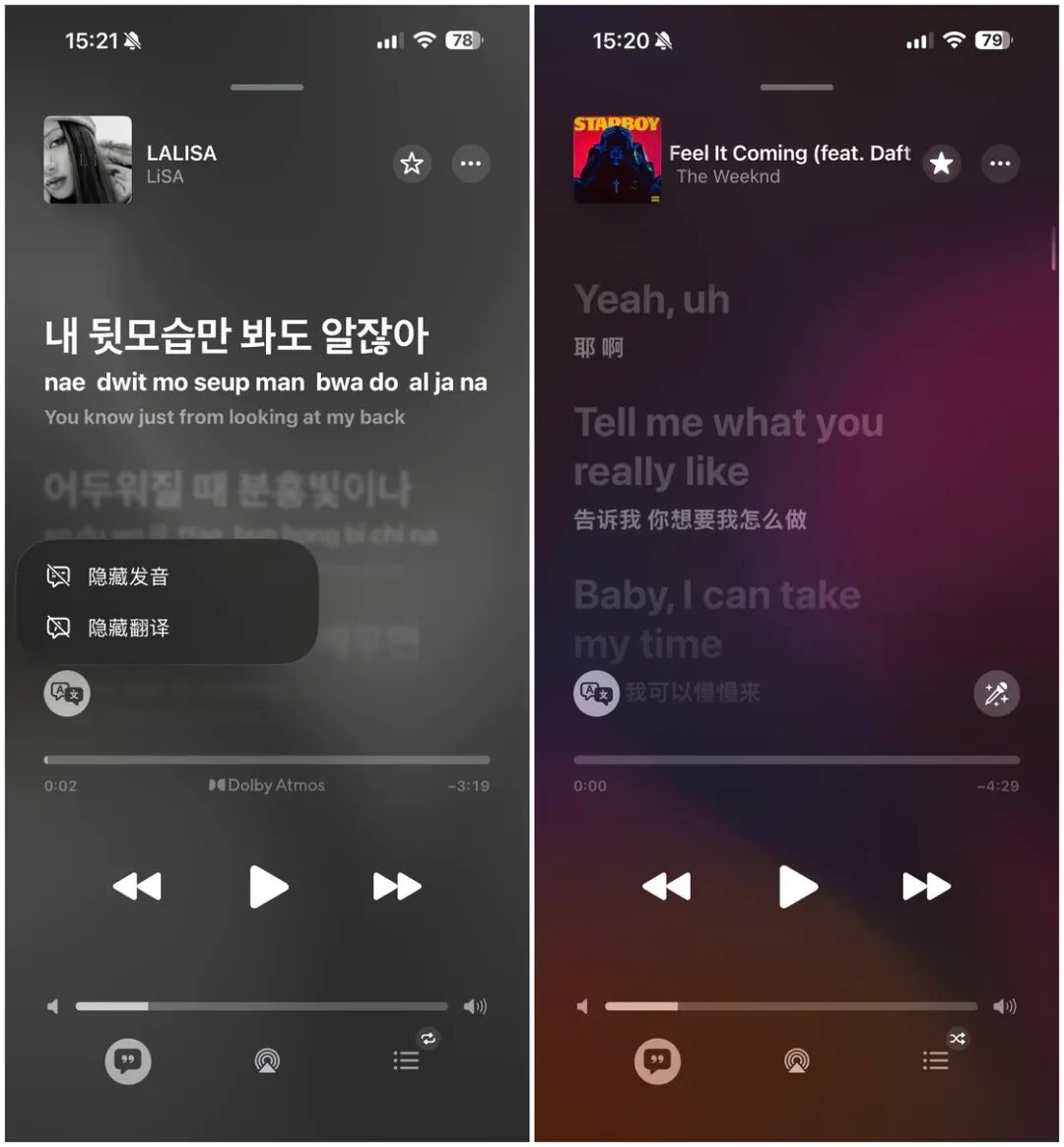 第二个是歌曲的翻译和注音功能,在收听非母语的歌曲时,我们可以点击歌词界面左下方的按钮打开歌词翻译或者歌词发音,这样一来翻译或者注音的文本就会同步显示在原歌词的下方,方便我们跟唱或者理解歌词的意思。