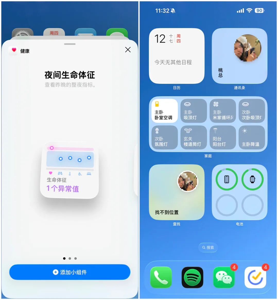 作为主屏幕的一部分,小部件也不例外。目前,通讯录、电池、家庭、查找等大量原生应用的小组件已经应用了 Liquid Glass 风格的半透明玻璃材质,相信之后也会有大量的第三方应用跟进这一特性。