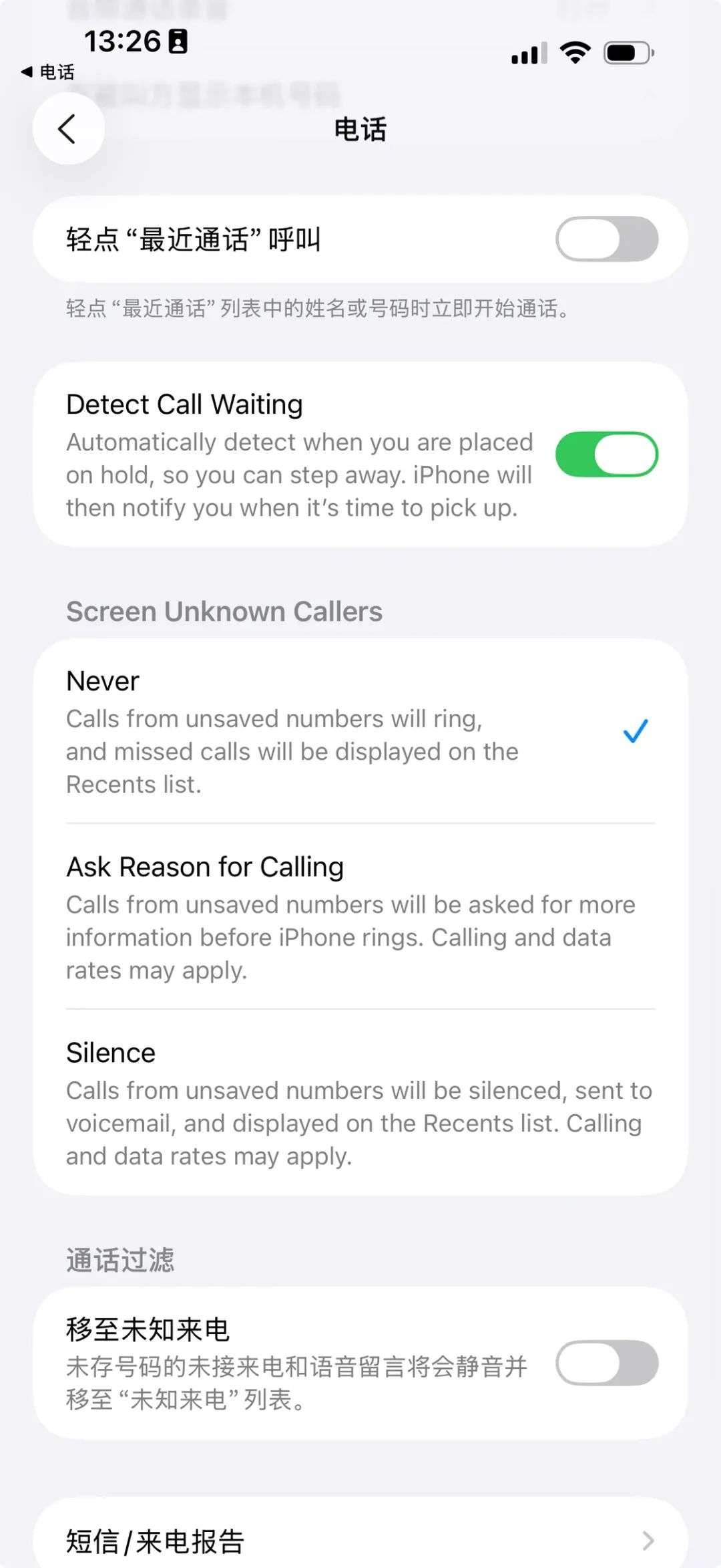 目前 iOS 平台上已经有不少第三方的来电拦截插件,不过这类插件最大的弊端就是容易「误杀友军」,所以 Apple 在 iOS 26 中加入了一个未知来电过滤的功能。在「设置-电话」中开启 Screen Incoming Calls 选项后,未知联系人的号码呼入时会要求对方提供更多的信息,对方提供后才会进行来电提醒,避免了错失重要电话的风险。