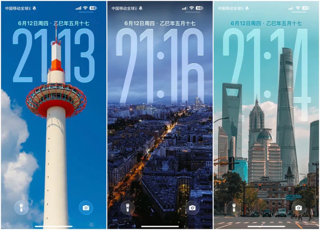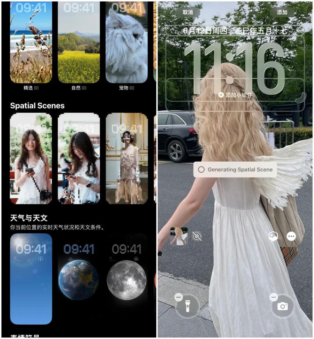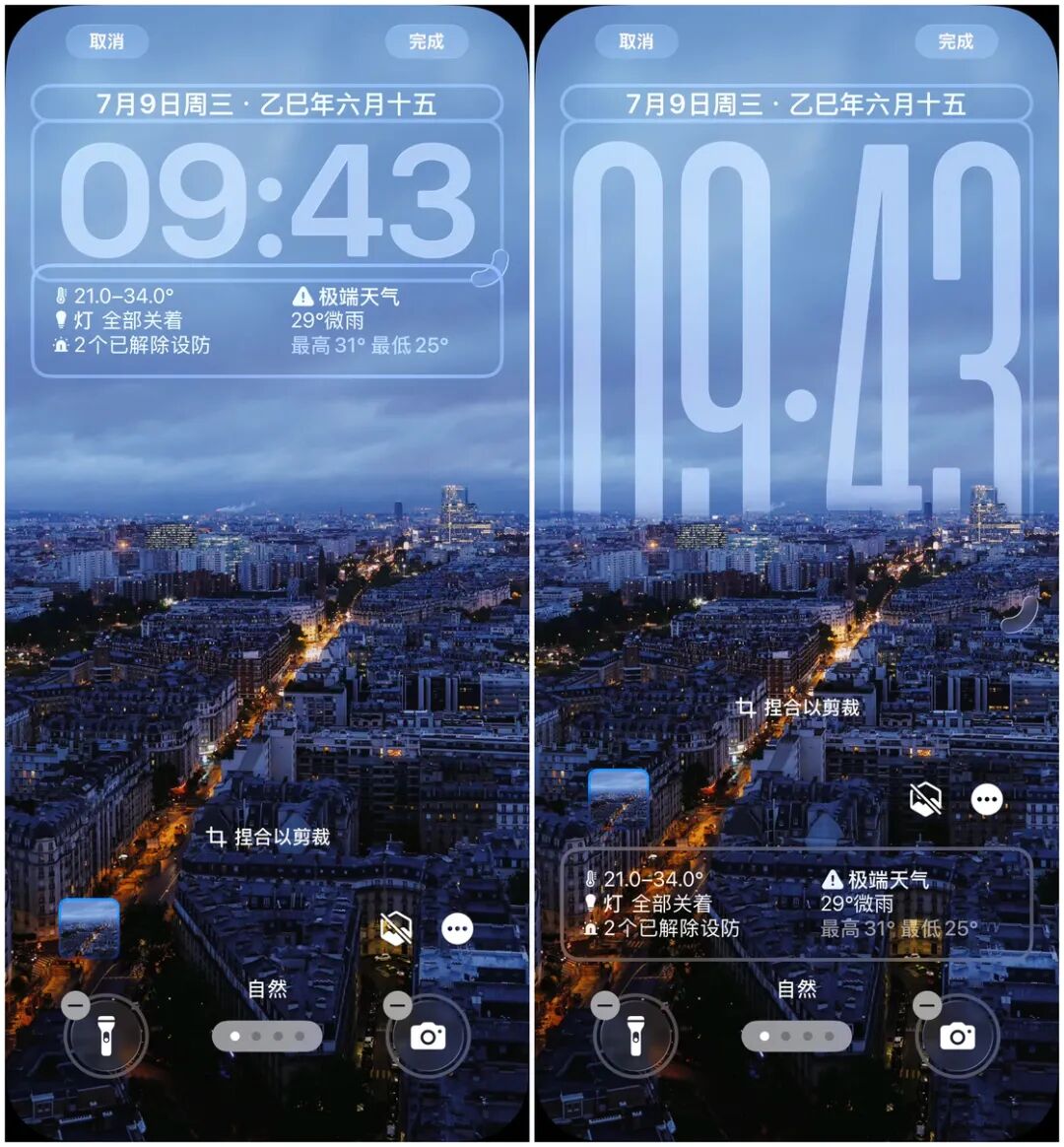 Apple 还为时间组件加入了根据壁纸的内容自动进行变化的特性,比如说你将壁纸设置为随机照片,就可以观察到每次壁纸更换时时钟组件都有所不同,包括字重、自宽和字高都会针对壁纸内容进行适应。