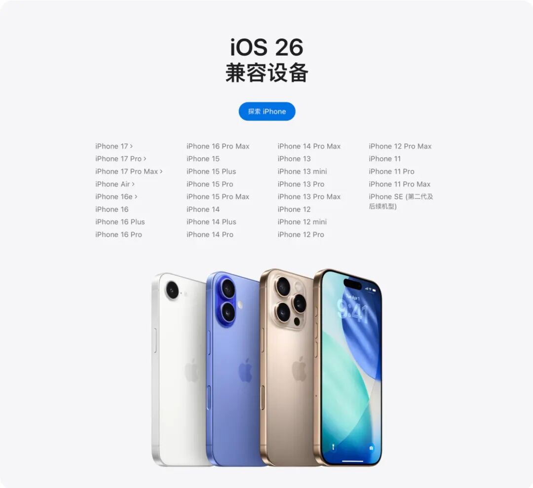 如果你想知道自己的设备是否能够升级新版系统,可以在 iOS 26 官网查看。据 Apple 官网提供的信息,iOS 26 支持 iPhone 11 (2019 年) 系列以及之后推出的产品:
