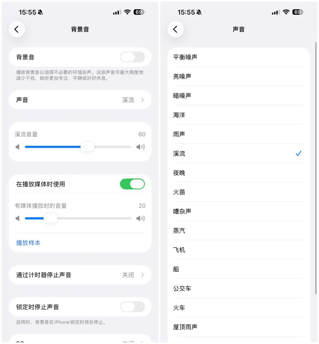 Apple 在 iOS 26 中添加了多个背景音的声音选项,我们可以在「设置-辅助功能-音频与视觉-背景音」中先启用这项功能,然后通过「声音」选项来从多达 16 种类型的声音中进行选择。