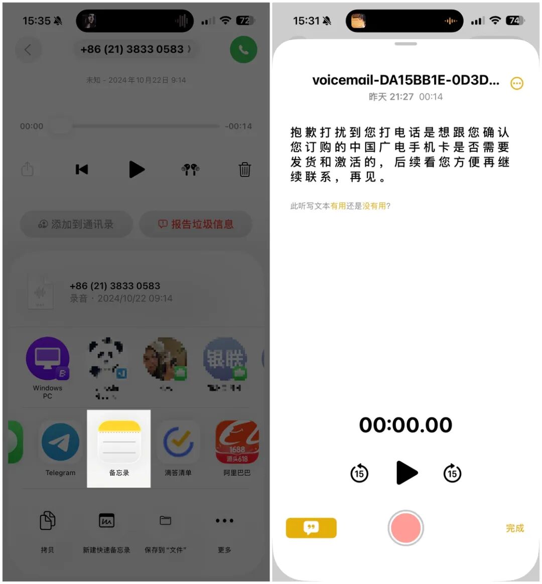 电话 app 中的语音留言可以直接通过分享菜单添加到备忘录中,而添加到备忘录中的语音录音不但会保留音频,还会直接转译成文本。