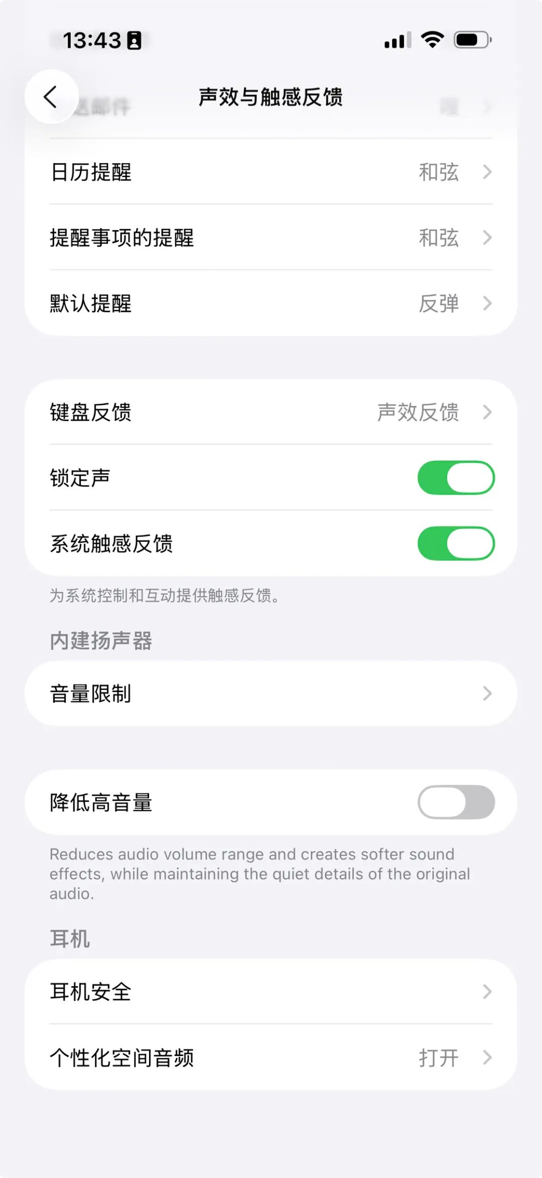 在「设置-声效与触感反馈」中,Apple 在 iOS 26 上新增了一个「降低高音量」,可以降低音频音量范围,营造更柔和的音效,同时保留原始音频中的细节。相信这功能在安静的地方会非常有用,只不过目前还有没有快速打开这个开关的方法。
