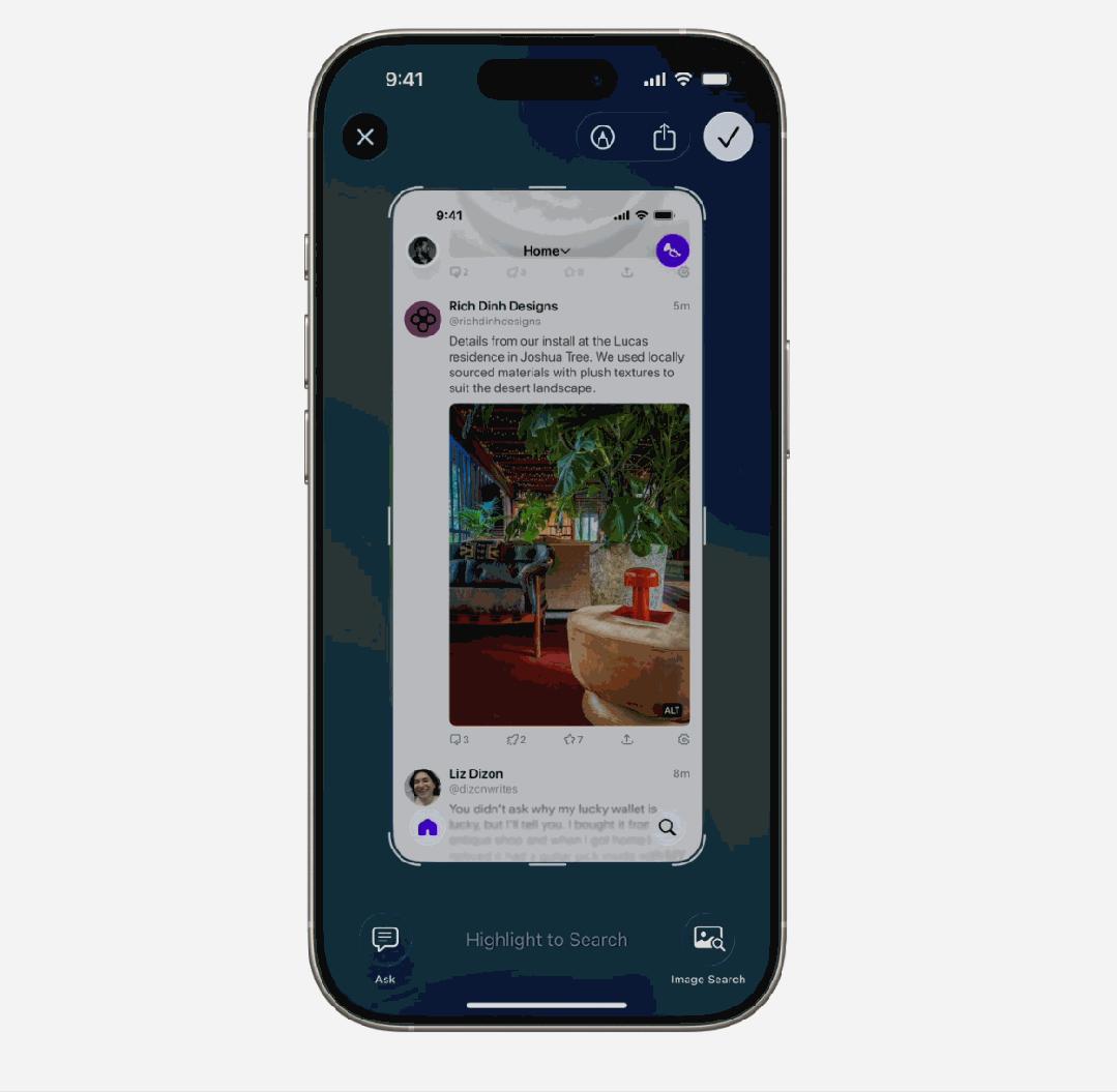 早先已在 iPhone 15 Pro 及更新的设备上推出的视觉智能功能,在 iOS 26 中新增支持了对 iPhone 屏幕上的内容进行分析和处理。操作的方法略显复杂,你需要先截图,然后在截图界面中分别点击下方的「Ask」或者「Image Search」按钮来进行下一步操作,比如说搜索图片内容、咨询相关问题或者是根据截图中的内容来创建提醒事项等。相比之下,Google Gemini 的操作效率就更高一点,在任意情况下长按屏幕底部就可以呼出 Google Gemini 并对屏幕上的内容进行下一步操作。