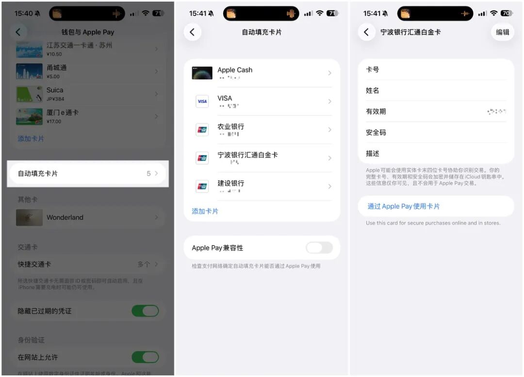 另外,钱包 app 还整合了「自动填充卡片」的功能,所有添加到钱包的银行卡都可以在这个模块中管理卡号、姓名、有效期、安全码、描述等信息。