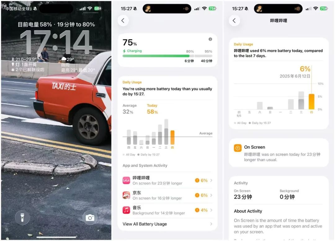 原先按 24 小时和 10 天划分的耗电量视图也被取消,Apple 在 iOS 26 中仅提供每周的平均电池使用视图,同时会告诉你耗电异常的情况。下方,则展示了各应用的耗电情况,告诉我们这些应用是否在后台运行时间较长,是否在屏幕上显示时间较长,或者是否发送了比平时更多的通知,帮助我们更加详细地了解 iPhone 的耗电情况。