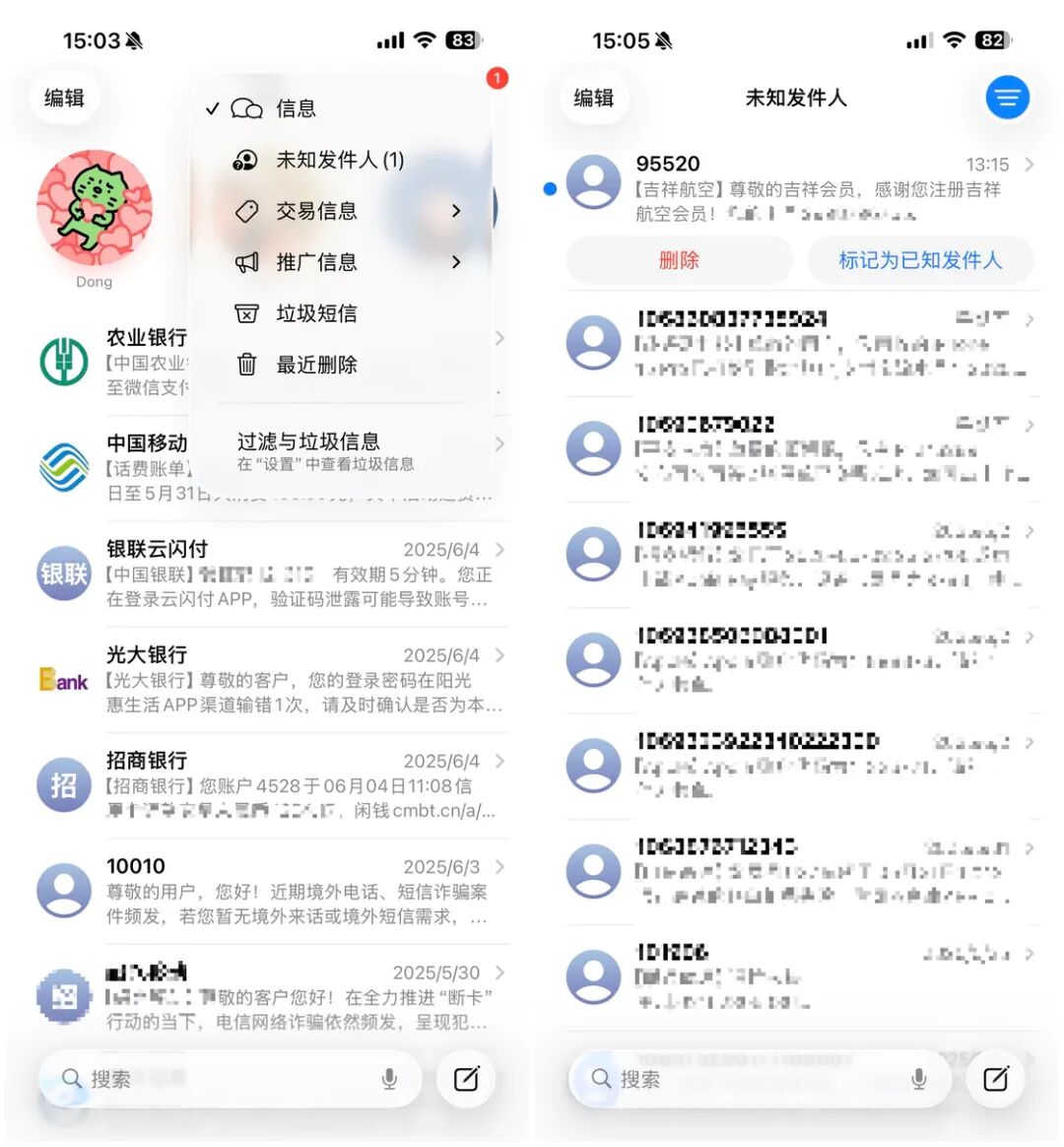 同样,信息 app 也加入了 Apple 自己的筛选未知发件人功能。在「设置-信息」中,我们可以看到这个选项是默认开启的,开启后所有未知发件人发送的信息都会直接进入到信息 app 的「未知发件人」列表中,不会在首页中显示。