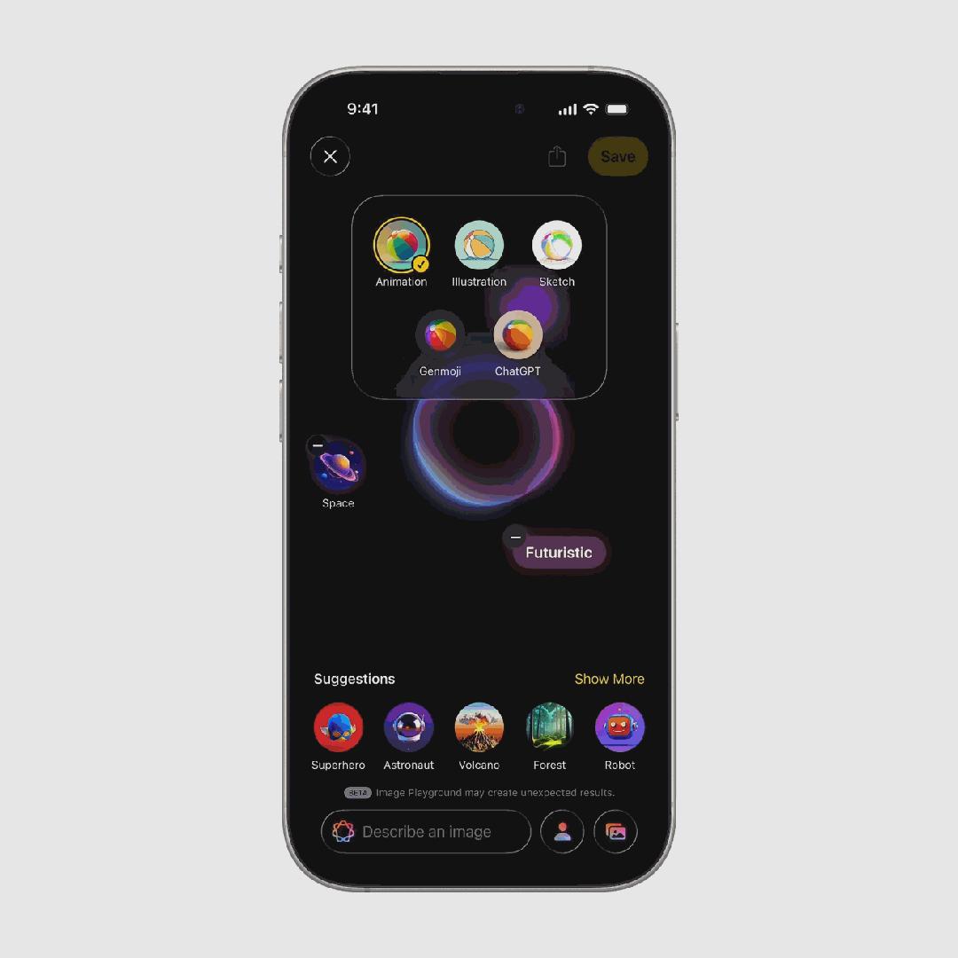在 iPhone 15 Pro 及更新的设备上的图乐园 app 中,Apple 为 AI 作画功能加入了更多的可能性。在新版本中,表情符号、Genmoji、文字描述都可以进行融合,还加入了 ChatGPT 的风格选项,大大丰富了创作的手段。