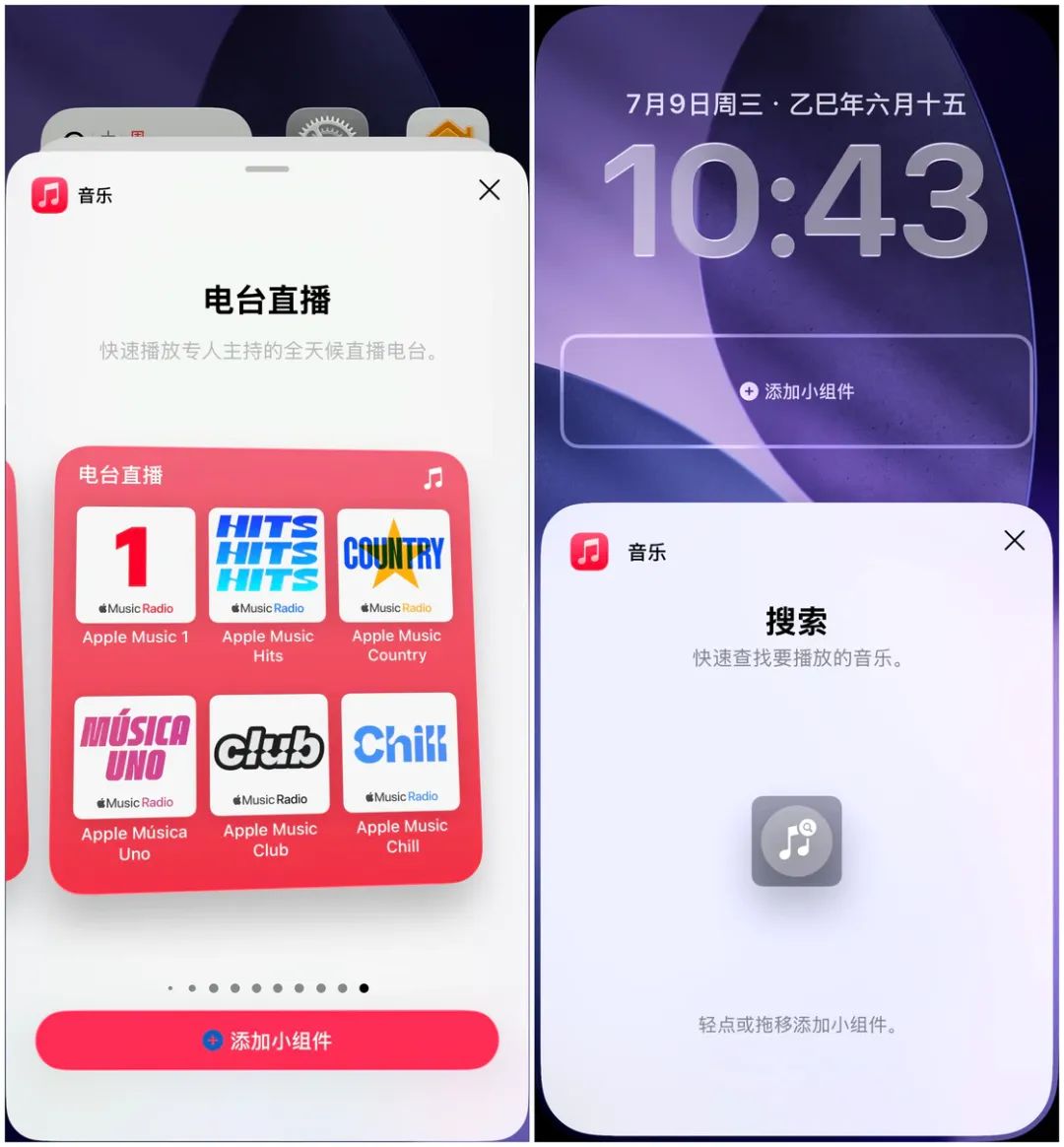 Apple Music 还新增了一个「电台直播」小组件,方便用户在主屏幕一键直达各类电台,快速收听节目。另外,Apple Music 还新增了一个「搜索」锁屏小组件,点击后可以直接打开 Apple Music 并进入到搜索界面。