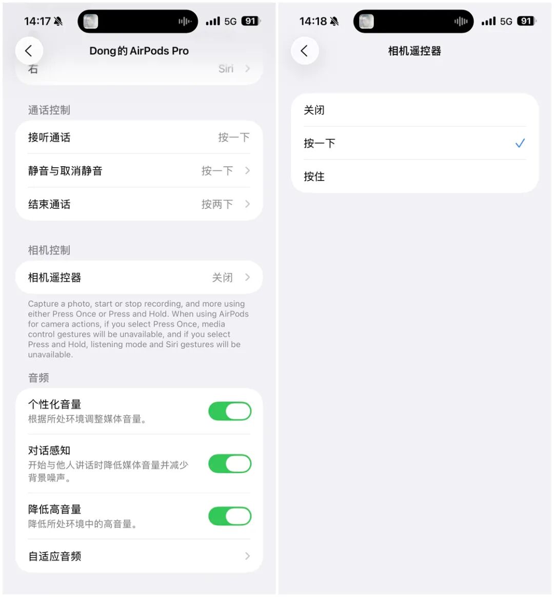 在相机 app 中,通过使用 H2 芯片的 AirPods Pro 和 AirPods,可以录制 HD 高音质的音频。另外,通过按住或者按一下 AirPods 的耳柄可以启动相机 app 的拍照或者视频录制功能。