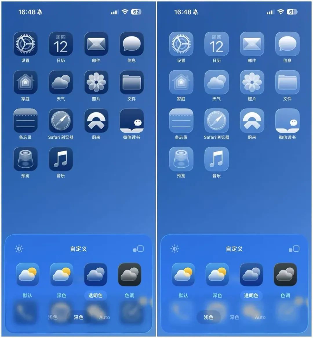 在主屏幕自定义界面中,Apple 在 iOS 26 中新增了一个「透明色」的选项,可以让所有应用图标都采用半透明玻璃的材质,并且可以选择浅色和深色两种风格。