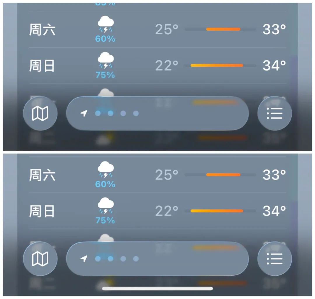 在 iOS 26 中,还有一个很容易被忽视的变化,那就是从 iPhone X 开始的底部横条降低了它的存在感。当我们打开任意一个应用时,底部横条会短暂地存在 2 秒左右,然后它就会自动消失。只有你重新去触摸一下屏幕的底部,横条才会重新出现,让用户继续进行回到主屏幕或者打开后台多任务中心的操作。