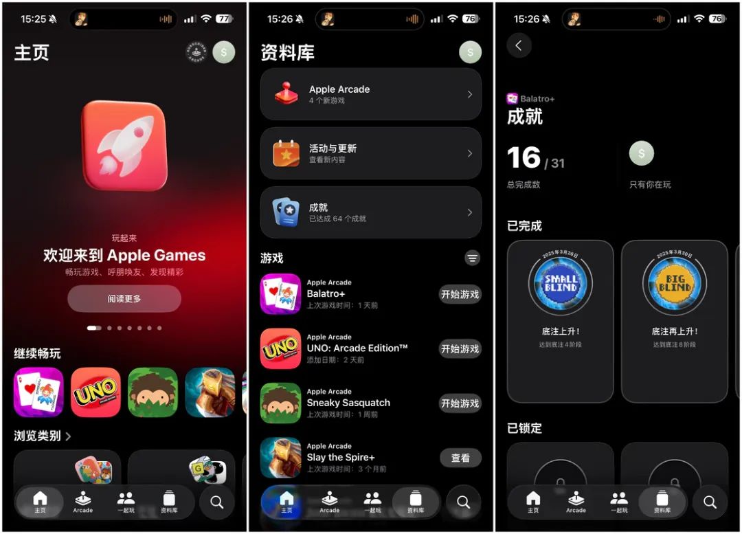 本次 iOS 26 版本中新增了一个系统应用「游戏」,这款新应用收纳了 App Store 上的众多游戏和 Apple Arcade,聚合了游戏商店、启动器、个性化推荐、社交、排行榜、成就系统等众多玩家喜爱的功能,基本上替代了原先的 Game Center。