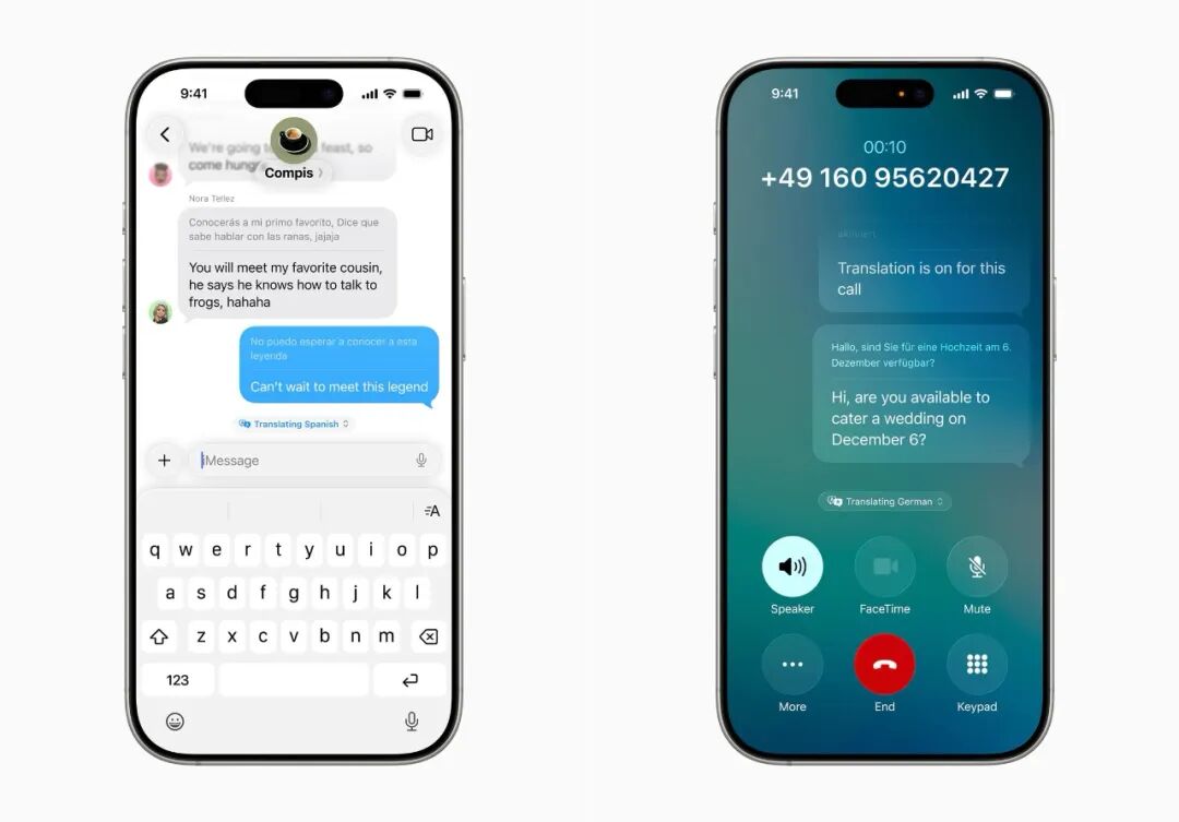 AI 对普通人最实用的赋能用途之一就是翻译,Apple 在 iOS 26 中增强了实时翻译的能力,将其整合进了信息、FaceTime、通话等自家的通讯工具中。以信息 app 为例,双方在发送信息的时候,文本会自动翻译成对方使用的语言,有效降低了不同语言的人沟通的成本。目前,通讯工具中的实时翻译功能只支持英语、法语、德语、葡萄牙语和西班牙语,且仅支持 iPhone 15 Pro 及更新的设备。