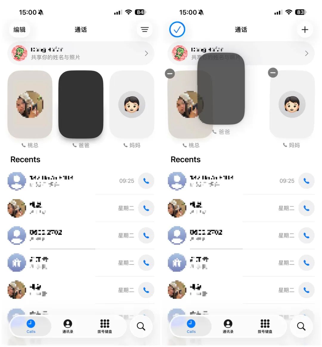首先,Apple 将电话 app 的 UI 进行了整合,之前的收藏、最近通话和语音邮件三个标签页都被统一到通话这个标签页中,收藏的联系人被置顶显示,可以手动更改排列顺序,最近通话和经过 Apple Intelligence 总结的语音留言内容则交织显示在下方的列表中。
