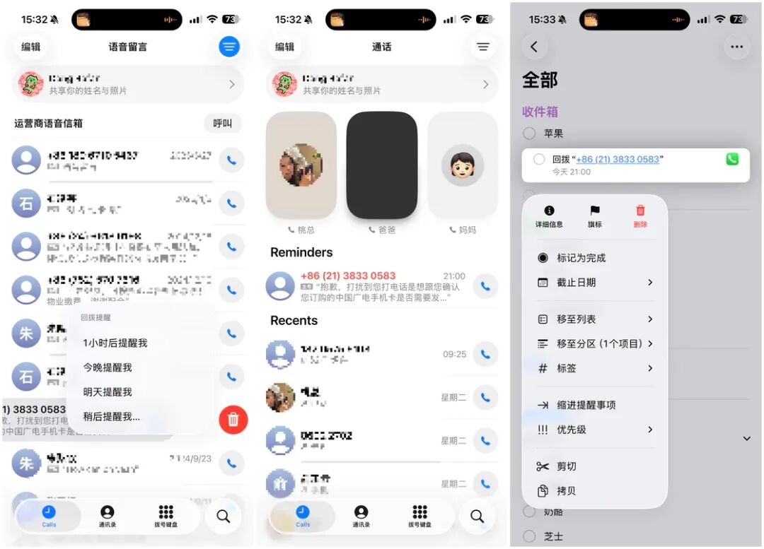 电话 app 中的通话记录通过左滑可以创建提醒,创建的提醒会置顶显示在 Calls 标签页的通话记录列表上方,同时在提醒事项 app 创建相应的一个提醒,并且可以点击电话号码一键拨打。