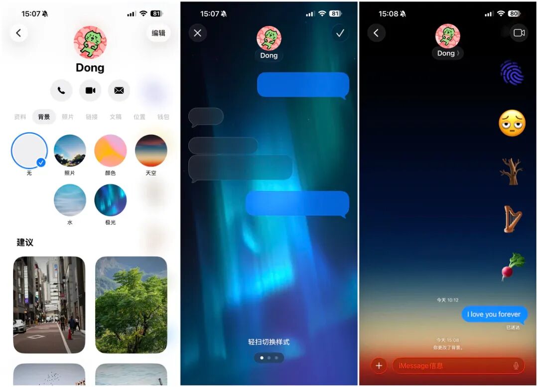 用户只需打开任意信息对话,点击顶部的联系人头像,在联系人详情页中切换至「背景」标签页,便可为该联系人的聊天界面设定专属背景。Apple 提供了多种默认壁纸选项,包括颜色、天空、水面、极光等类型,当然也可以从照片 app 中任选图片作为背景使用。