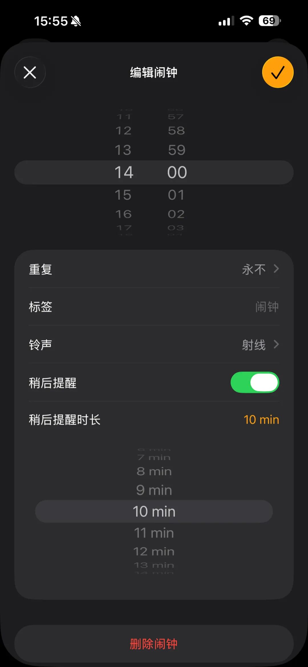 闹钟功能在新版本加入了一个几乎每个人都需要的功能 —— 自定义稍后提醒时长,我们可以自由地从 1 分钟到 15 分钟之间进行选项,充分满足每一个赖床爱好者的个性化需求。