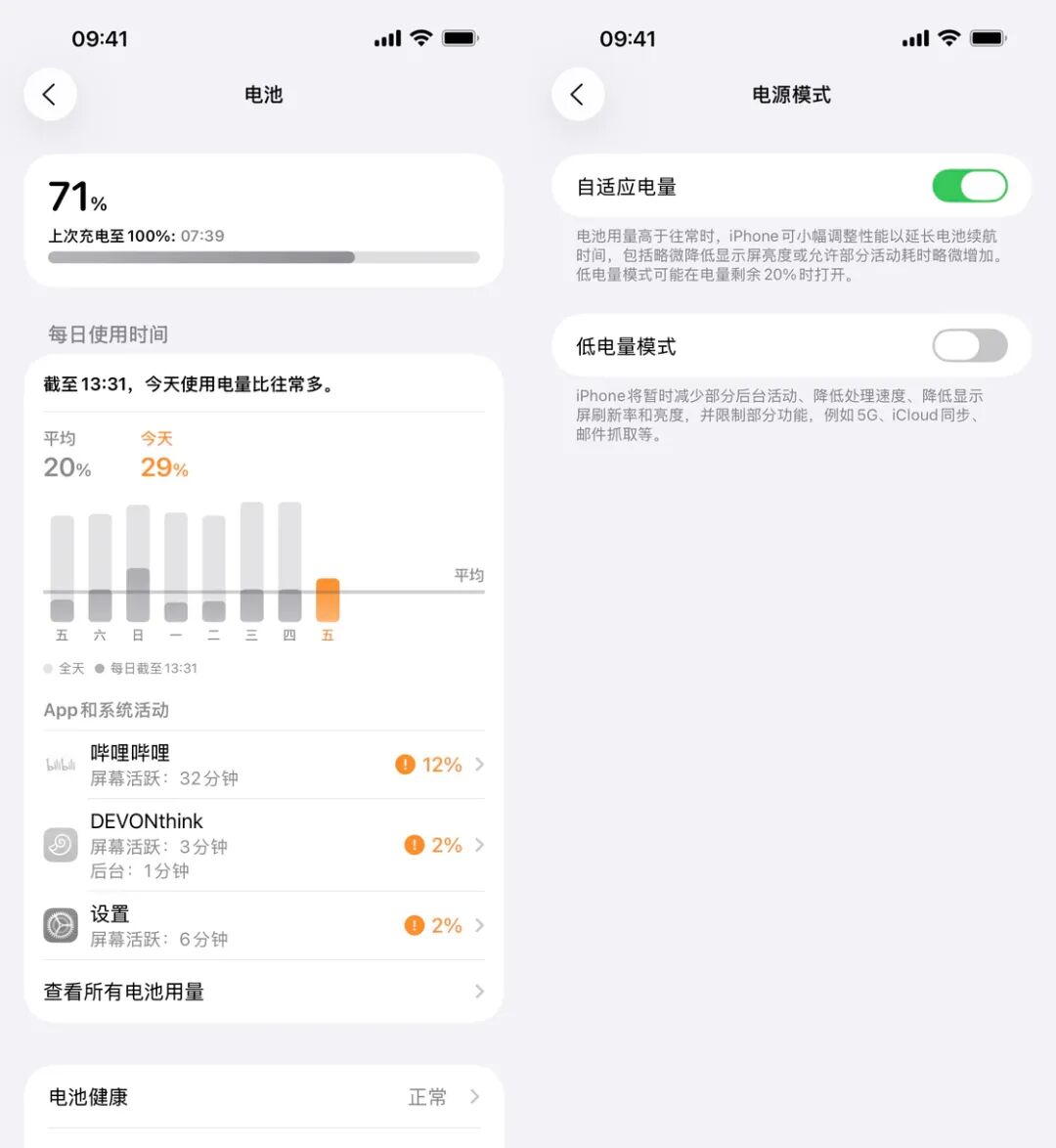 首先,Apple 在设置中为 iPhone 15 Pro 及更新的机型加入了一个「自适应电量」的功能,这个功能可以在 iPhone 比往常更加耗电时自动启用,系统会调整性能表现来延长电池续航,比如说降低屏幕显示亮度、降低性能释放等,同时在电量下降到 20% 时自动启用低电量模式。