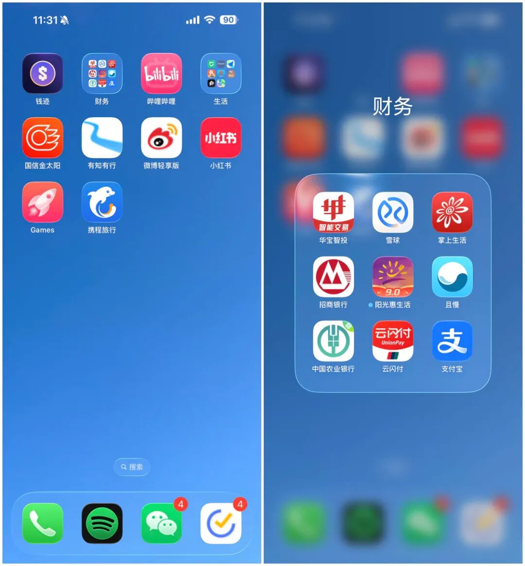 其次是应用文件夹,不管是缩小的状态下还是点击放大的状态下,都是非常直白、纯粹的一个半透明玻璃效果,特别是在点击放大的状态下,可以轻易地观察到文件夹对背景的折射效果。
