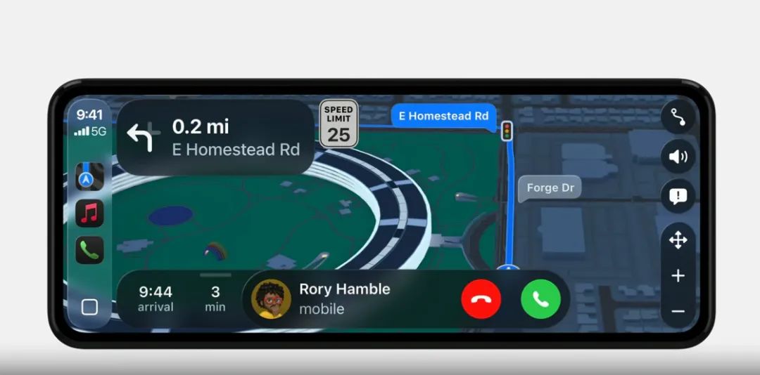 首先,Apple 终于把原来全屏的来电视图给取消了,采用了更加紧凑小巧的来电视图,从而可以保留完整的导航信息。对于 Carplay 来说,这一点可以说是「史诗级」升级。