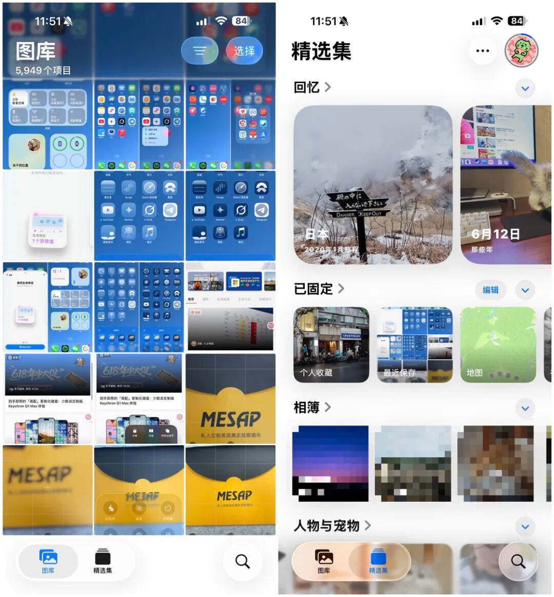 图库包括了所有的照片,可以通过右上角的筛选按钮进行过滤或者更改显示和排序选项;精选集包括了所有的回忆、相簿、人物与宠物、共享相簿、最近的日子、旅程、媒体类型、更多项目等功能,可以帮助我们更好地整理、分享照片。