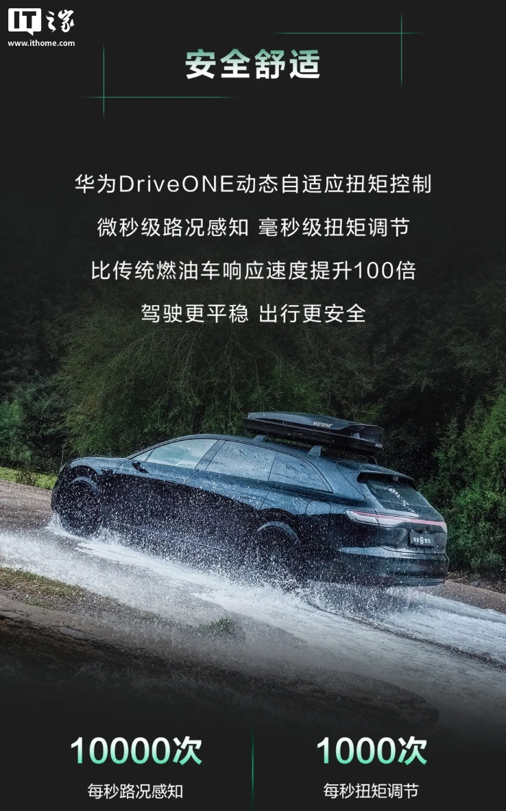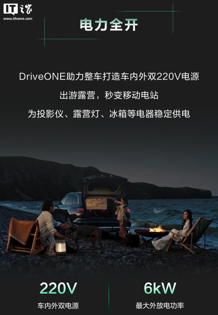 华为 DriveONE 支持动态自适应扭矩控制,可微秒级路况感知、毫秒级扭矩调节,比传统燃油车响应速度提升 100 倍。另外,DriveONE 可辅助整车打造车内外双 220V 电源,支持为投影仪、露营灯、冰箱等电器稳定供电。