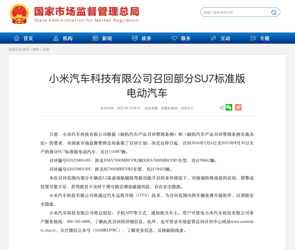 9月19日,小米汽车科技有限公司向国家市场监督管理总局备案了召回计划,此次召回包含2024年2月6日至2025年8月30日生产的部分SU7标准版电动汽车,共计116887辆。