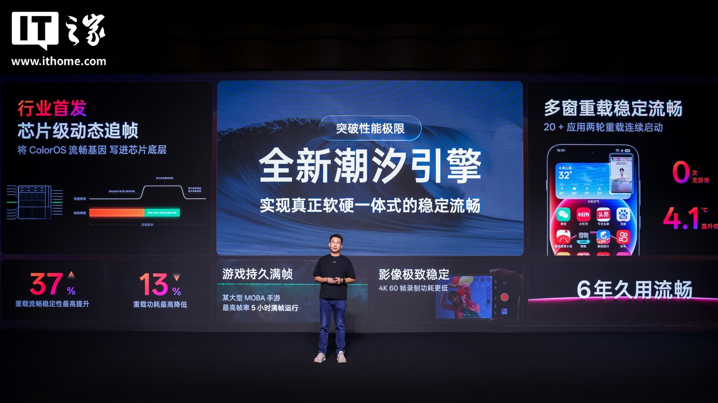 ColorOS 平台软件研发总监孙中兰随后登台介绍了“潮汐引擎”,这款引擎带来了行业首发的全新芯片级动态追帧技术,从系统底层出发,更加准确地捕捉系统绘制需求,当预测到渲染任务无法在动画帧周期内完成时,潮汐引擎便会动态提升芯片算力供给,避免渲染未及时完成导致的掉帧卡顿。